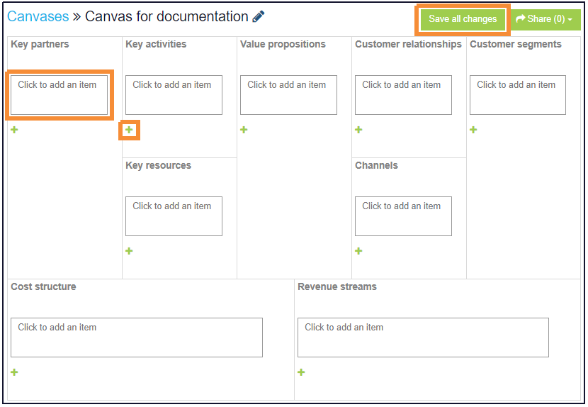 - You'll now be taken to your blank canvas, which you can edit. Click into the text box to add content. Click the green plus + to add more content into one section. You must press Save all changes after each change you make or your work will be lost - canvases do not autosave at this time