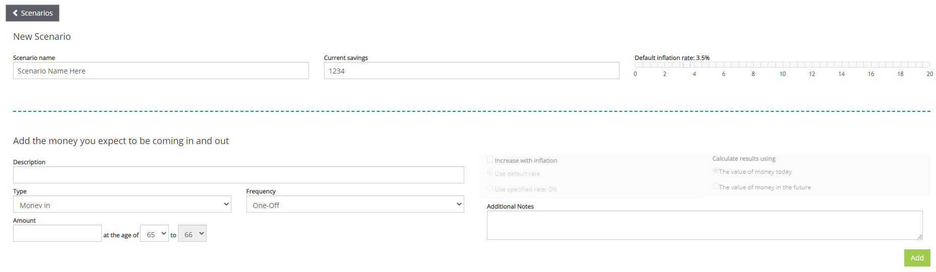 If you are taken to a list of your client's scenarios, you can add a new one by click the New Scenario button in the top right. - Give your scenario a Name and state your client's current savings. Your scenario won't be saved until you add your first income/expense- see the next step for how to do this