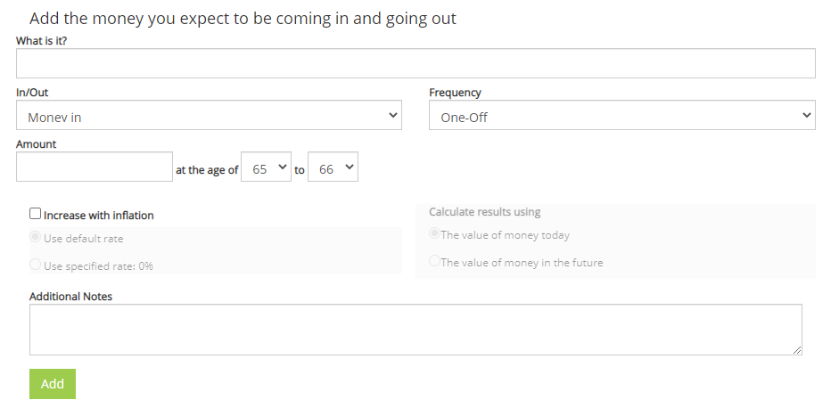 - Use the Frequency drop-down to state if it's a one-off expense/income or ongoing. If the expense is ongoing then you can choose how many years it will be ongoing for by using the age drop-downs. You can also choose to increase the income with inflation, using the options on the right hand side