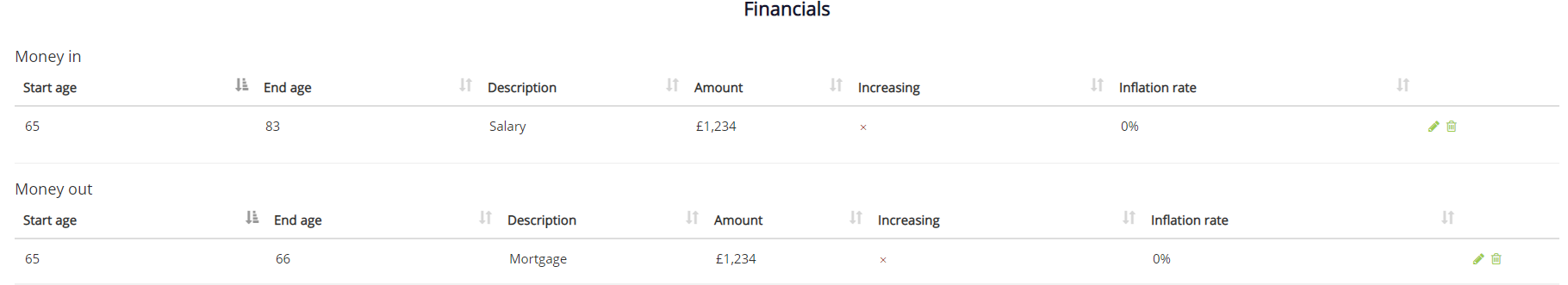 - See a breakdown of all the financials you have added in tables at the bottom of the page